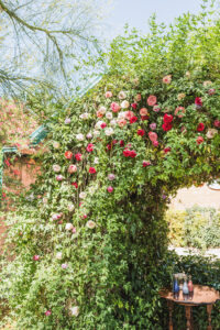The lush garden setting accommodates romantic, garden-inspired styling. Florals. Natural elements. Soft colors. Everything flows with the established landscape.